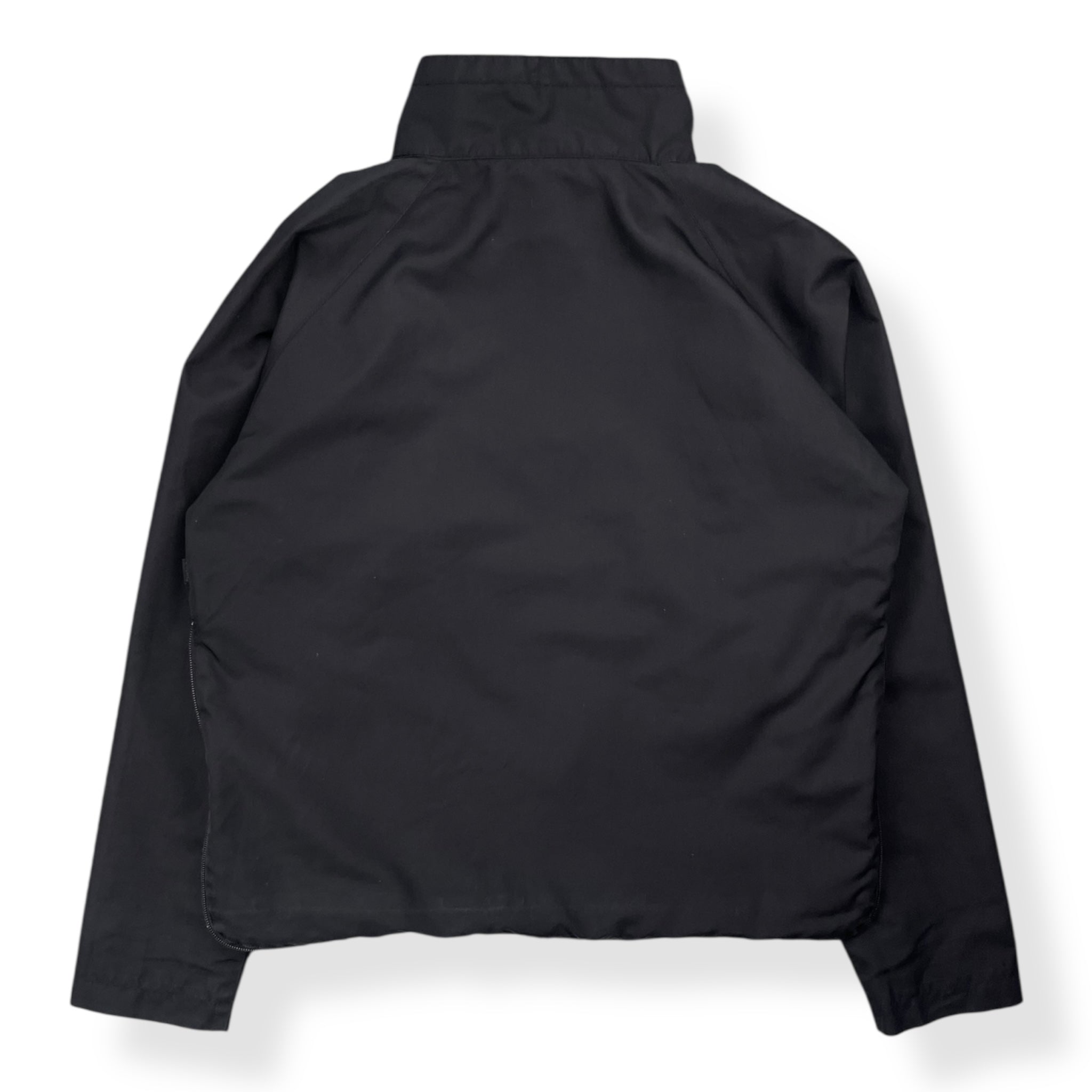 Black exterior with a green nylon interior. Asymmetric dual zip neck opening, huge front pouch pocket with branded metal press studs & a unique fully zippable waist hem. The jacket can convert to a messenger style bag when the hem is zipped & the sleeves tied around the body. The zips jacket be opened for a looser & more breathable fit, or can be closed to create a tighter fit to the body.