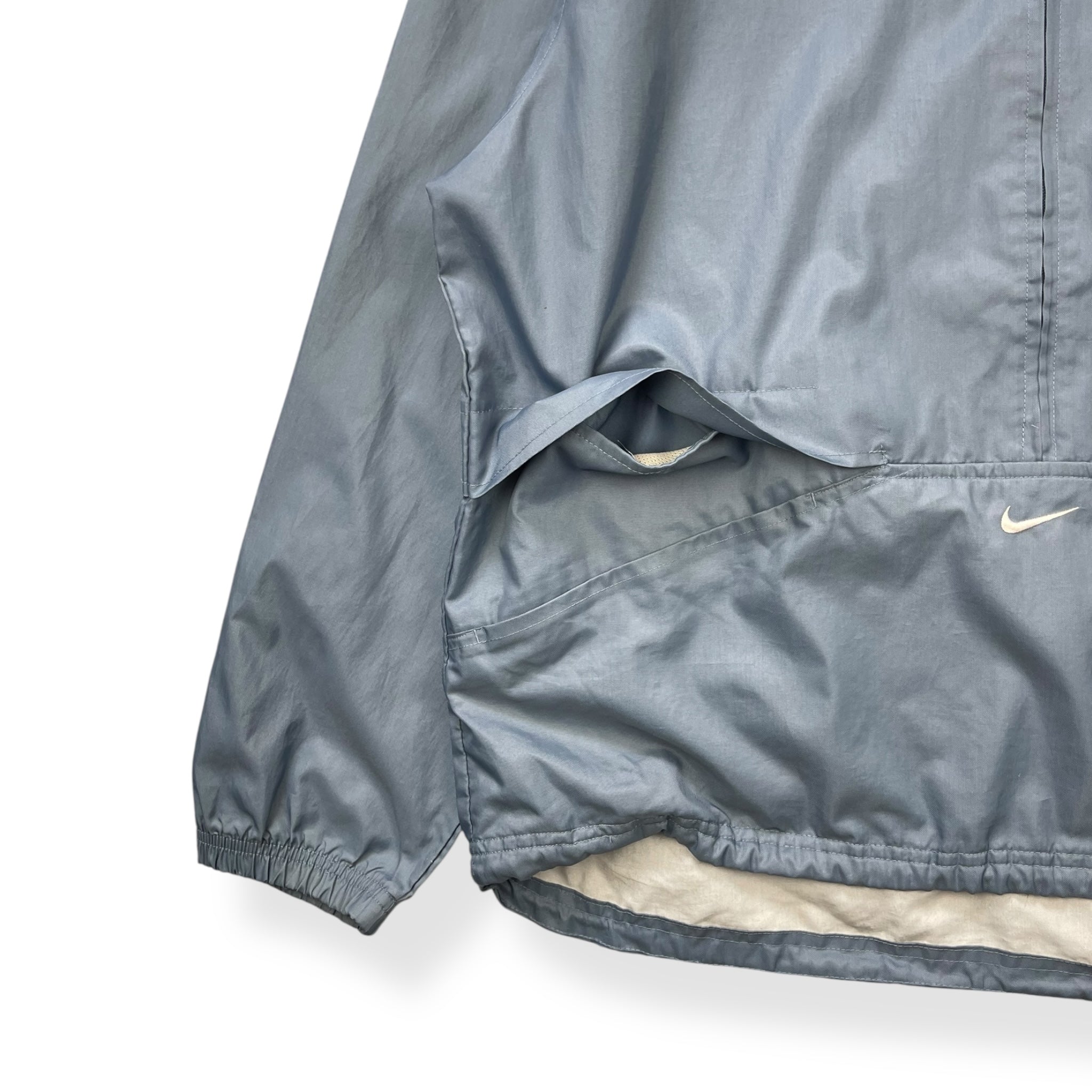 Similar design to some Nike Code & Presto designs, with a central embroidered swoosh on the front & back of neck. Sleek front pocket design with all pockets concealed by fabric, both sides with a zipped pocket & one side with a double pocket design with a pouch pocket above the zipped pocket. Lightweight, packable hood, ventilation flaps on the back.