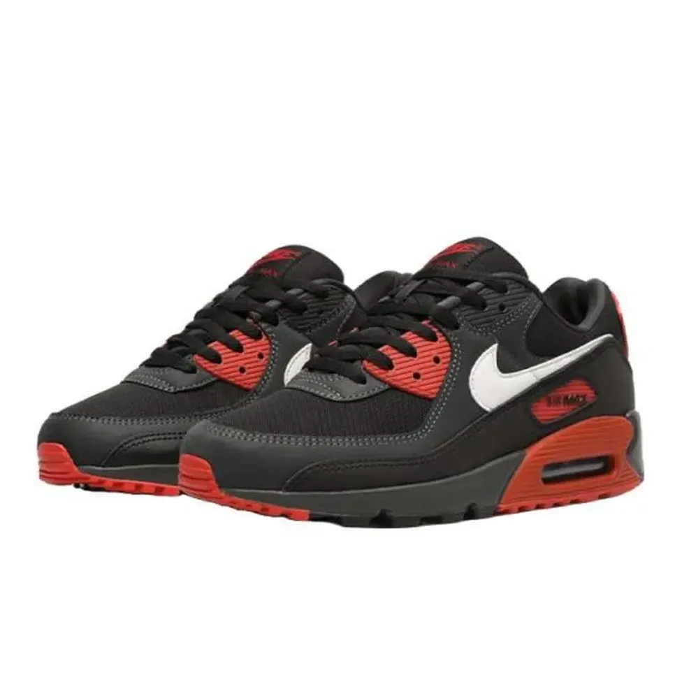 These Nike Air Max 90 sneakers feature a stunning combination of black and fiery red hues. The black textile base is complemented by a tonal nubuck mid-panel and mudguard, while a white leather Swoosh on both sides adds to the shoe's overall aesthetic. Furthermore, the midsole flaunts a red-coloured panel with a visible Air cushioning unit.