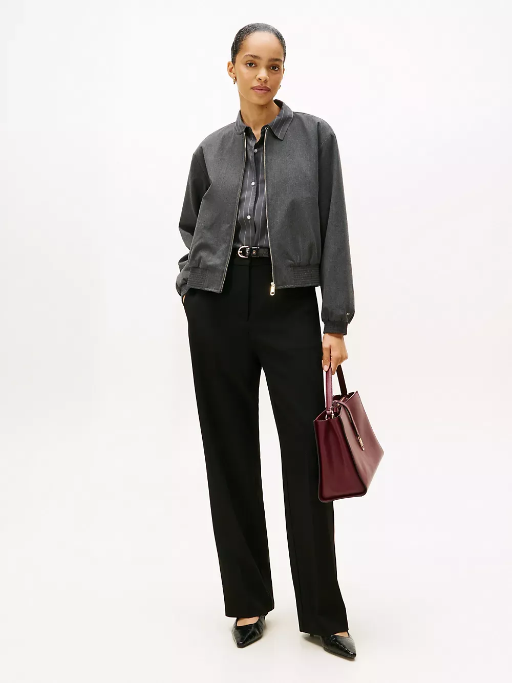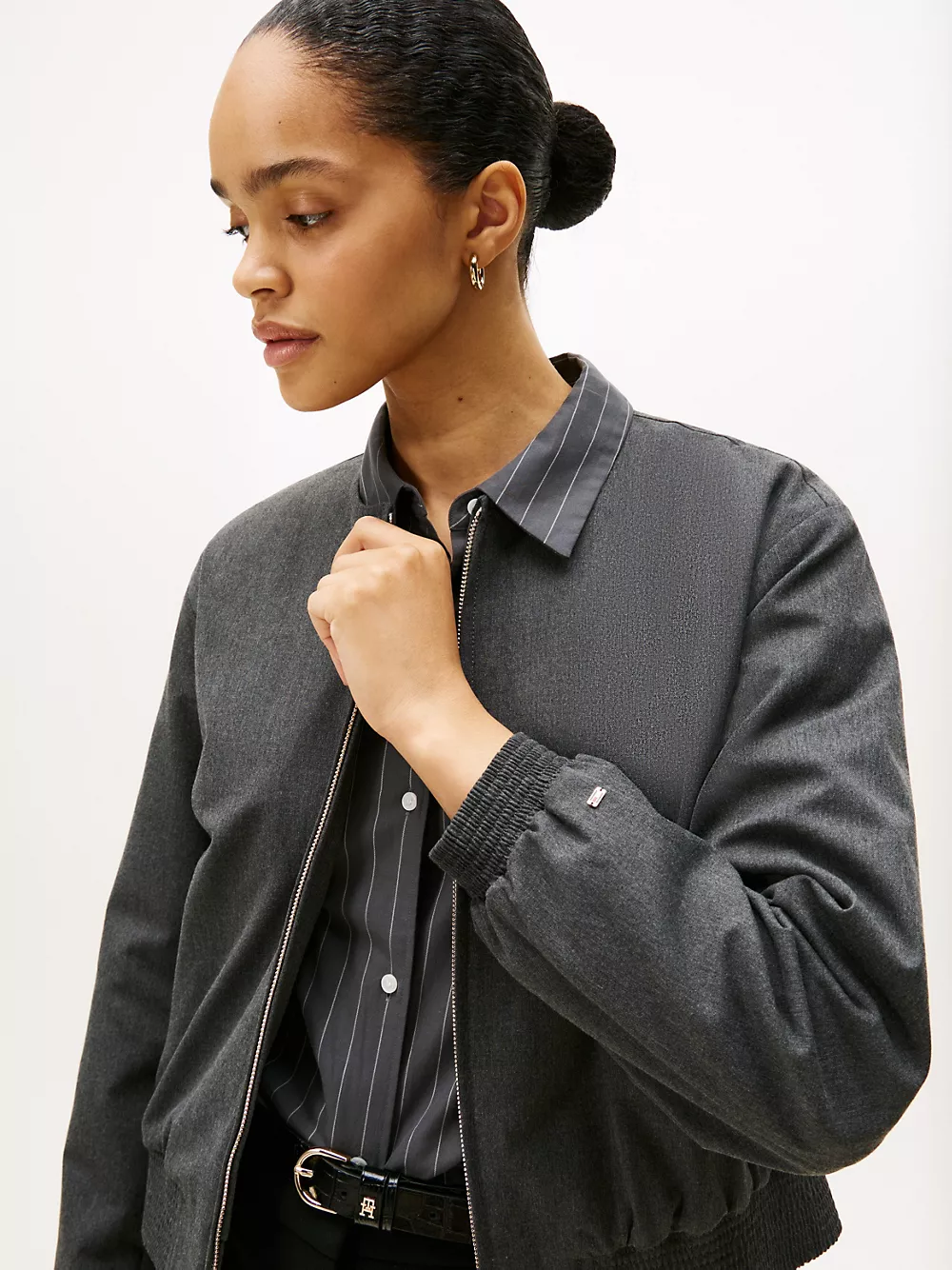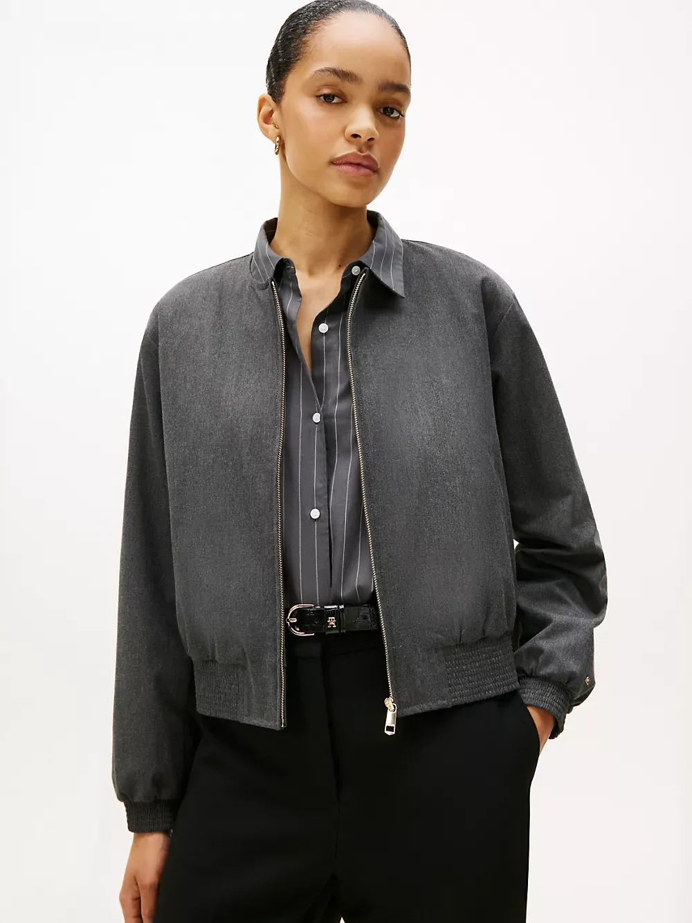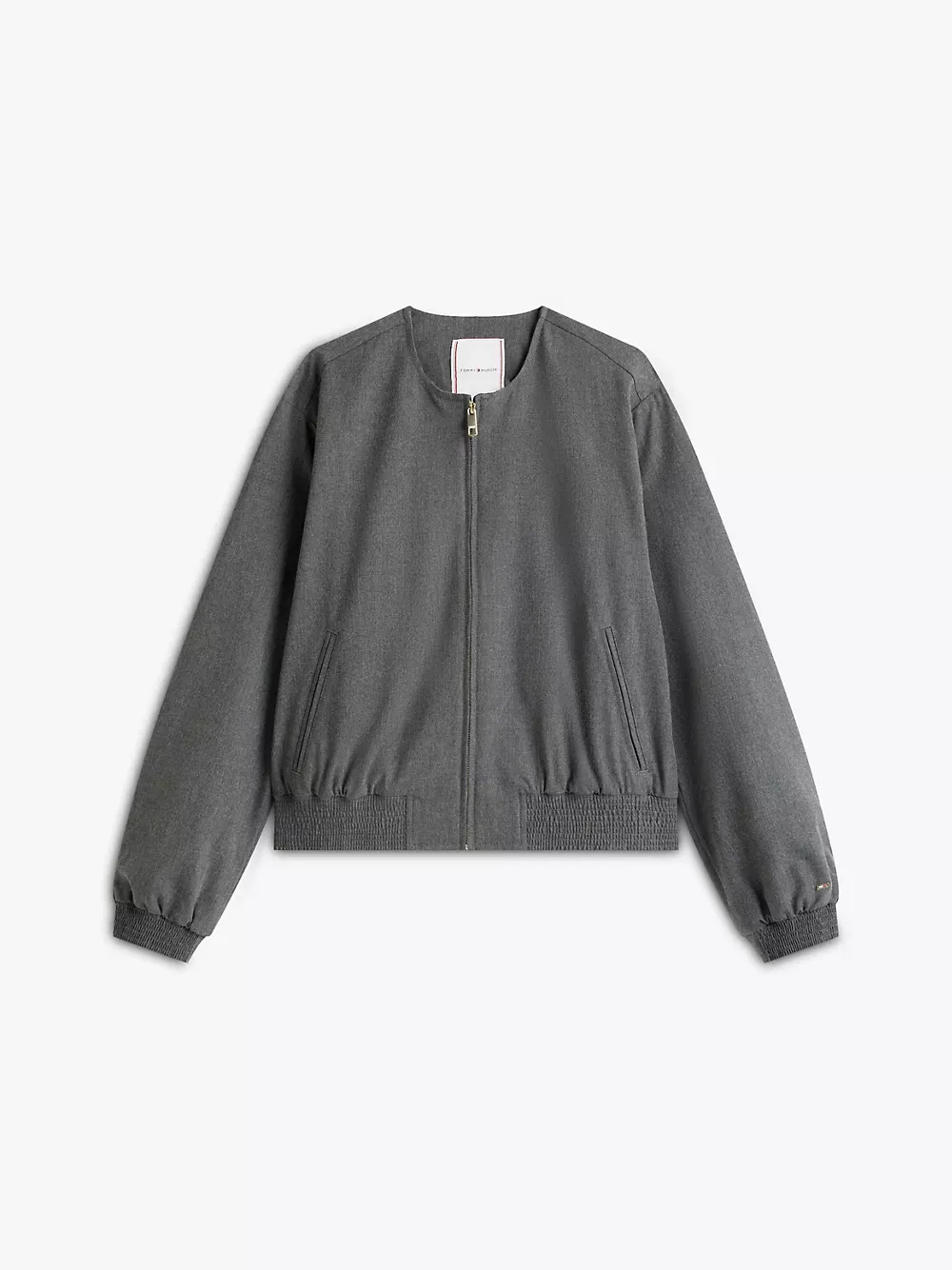 Tommy Hilfiger women's jacket. Our flattering bomber is made from a stretchy, midweight blend with a soft, smooth feel. This versatile piece features side welt pockets, a shirred hem and a collarless neckline for a clean finish.