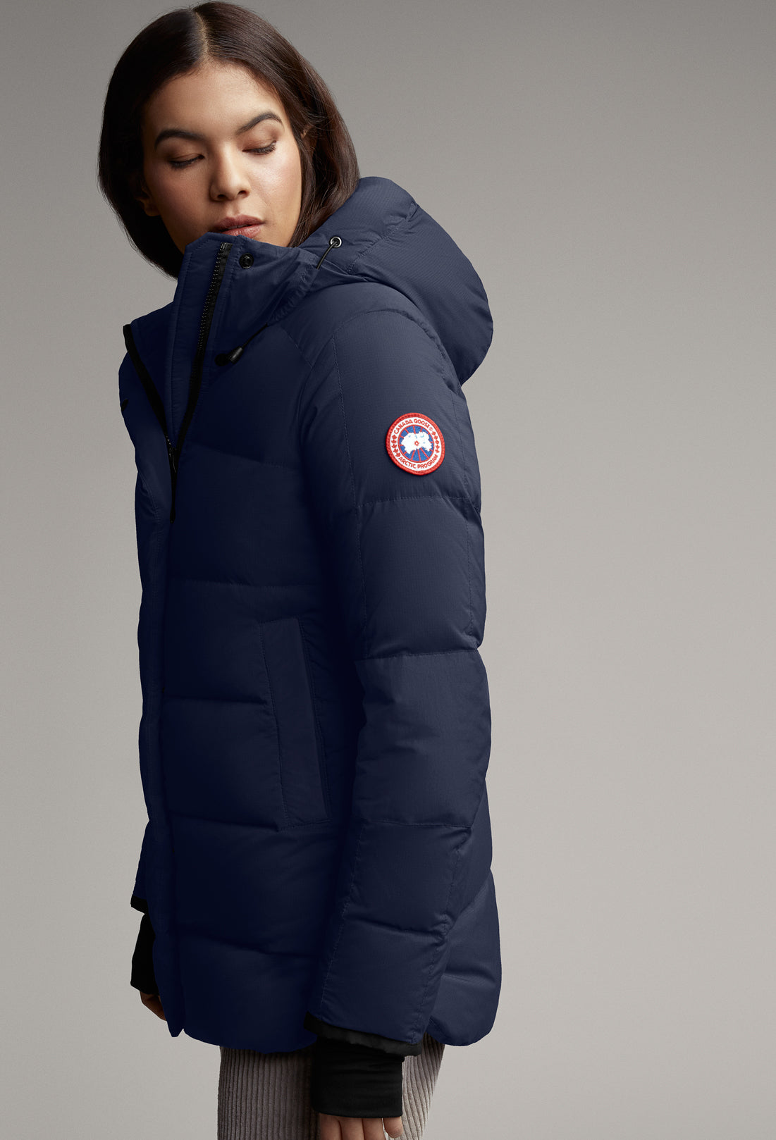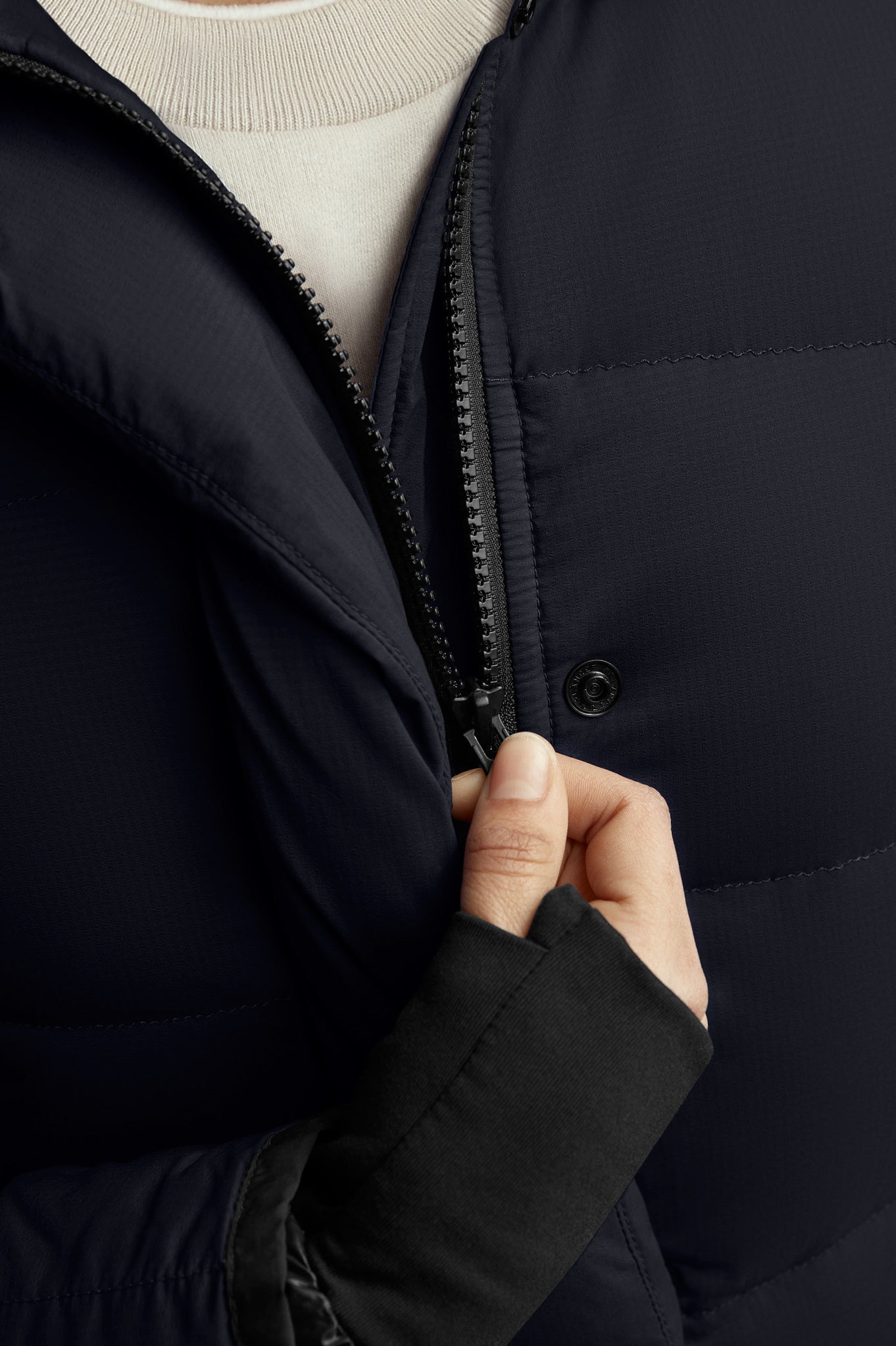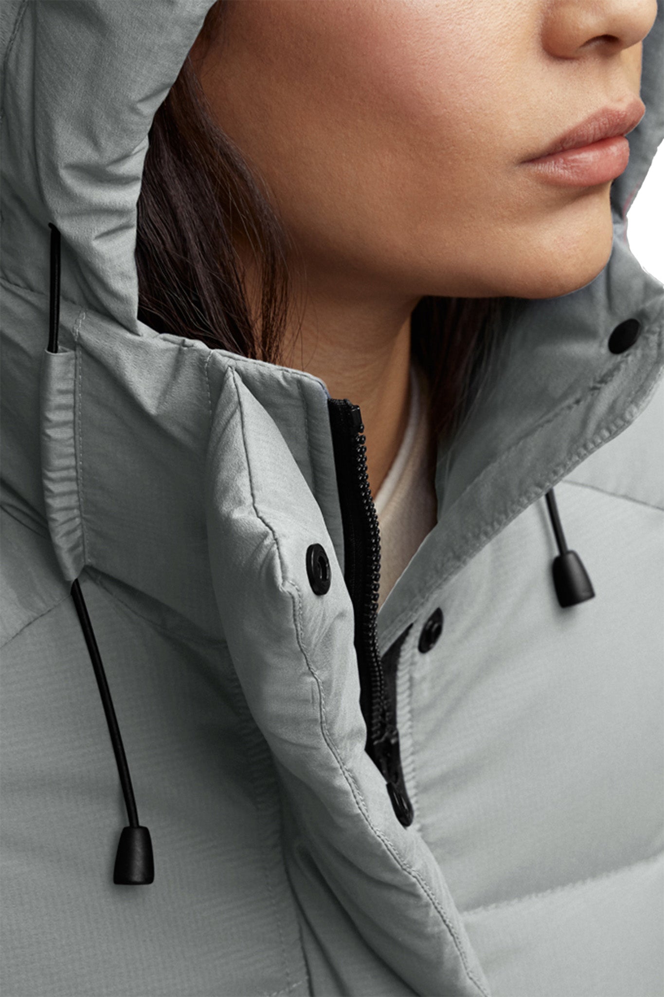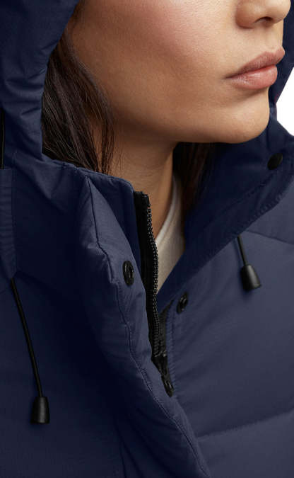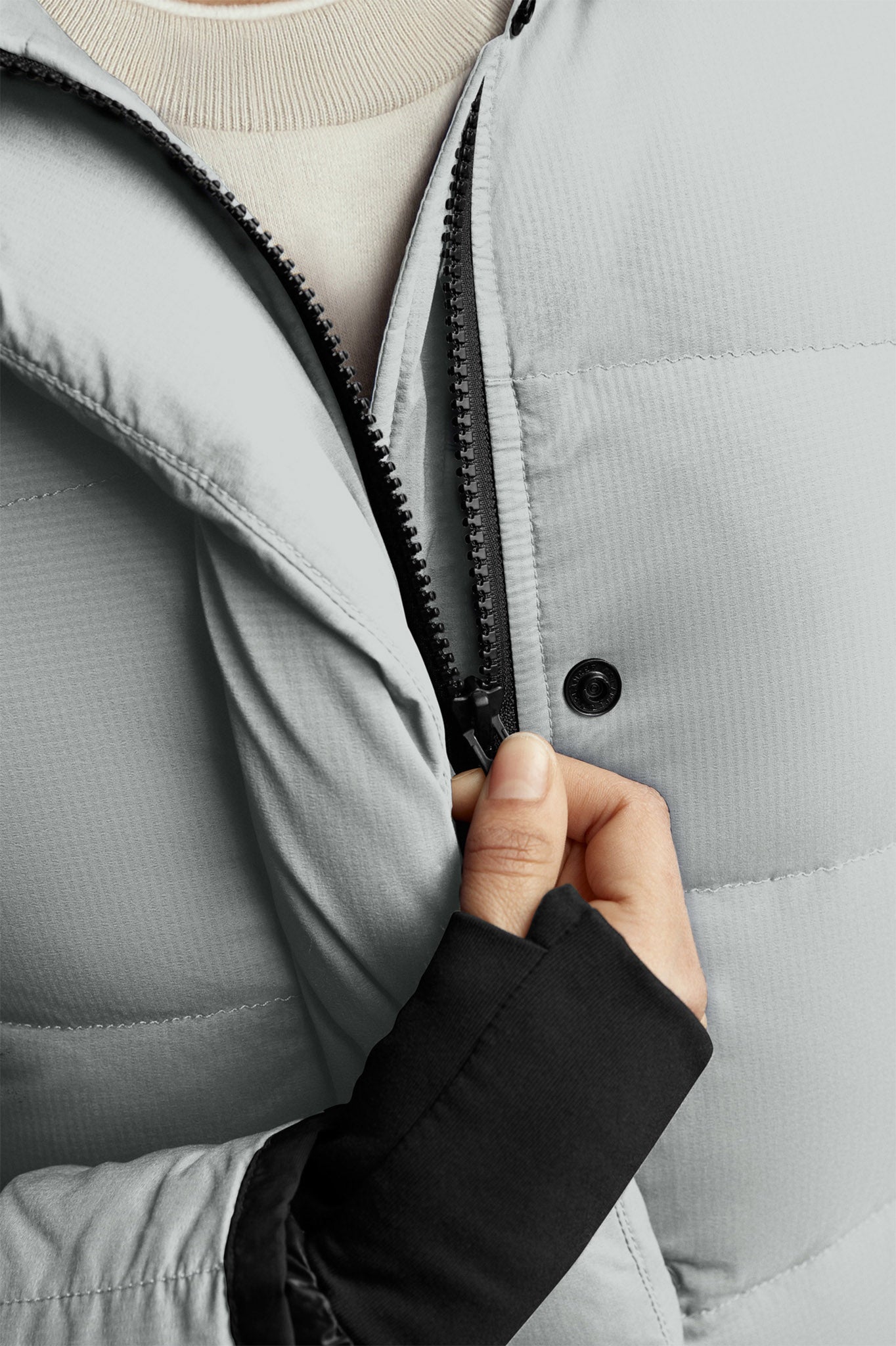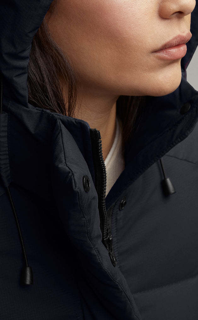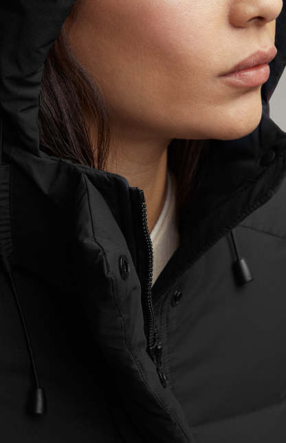 - La patte garnie de duvet avec fermeture à boutons-pression dissimulée recouvre la fermeture éclair à deux sens pour vous protéger contre les éléments. Ouvrir la fermeture éclair à partir du bas pour accroître l’amplitude des mouvements ou vous aérer