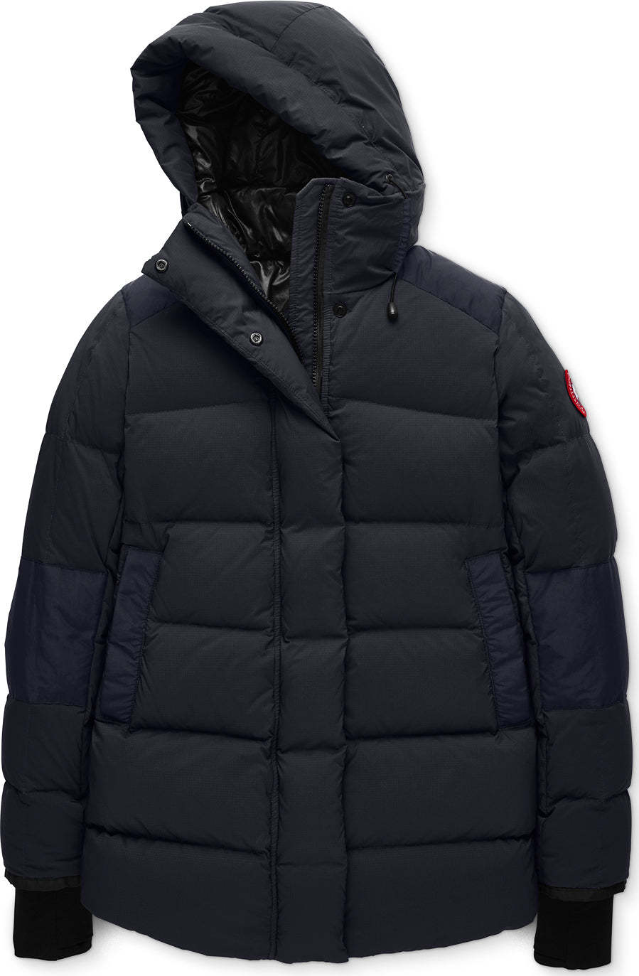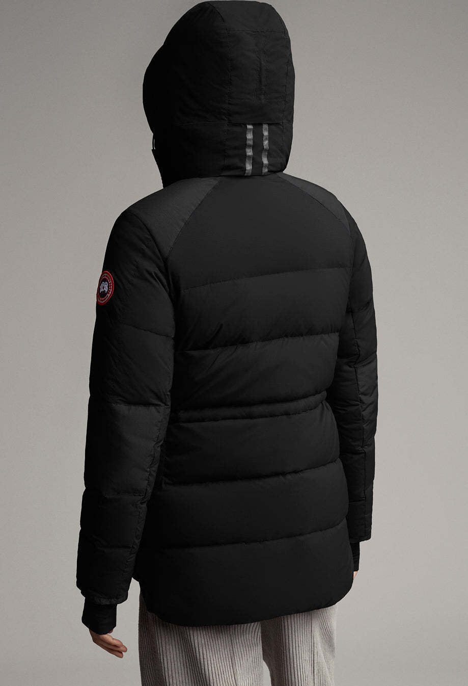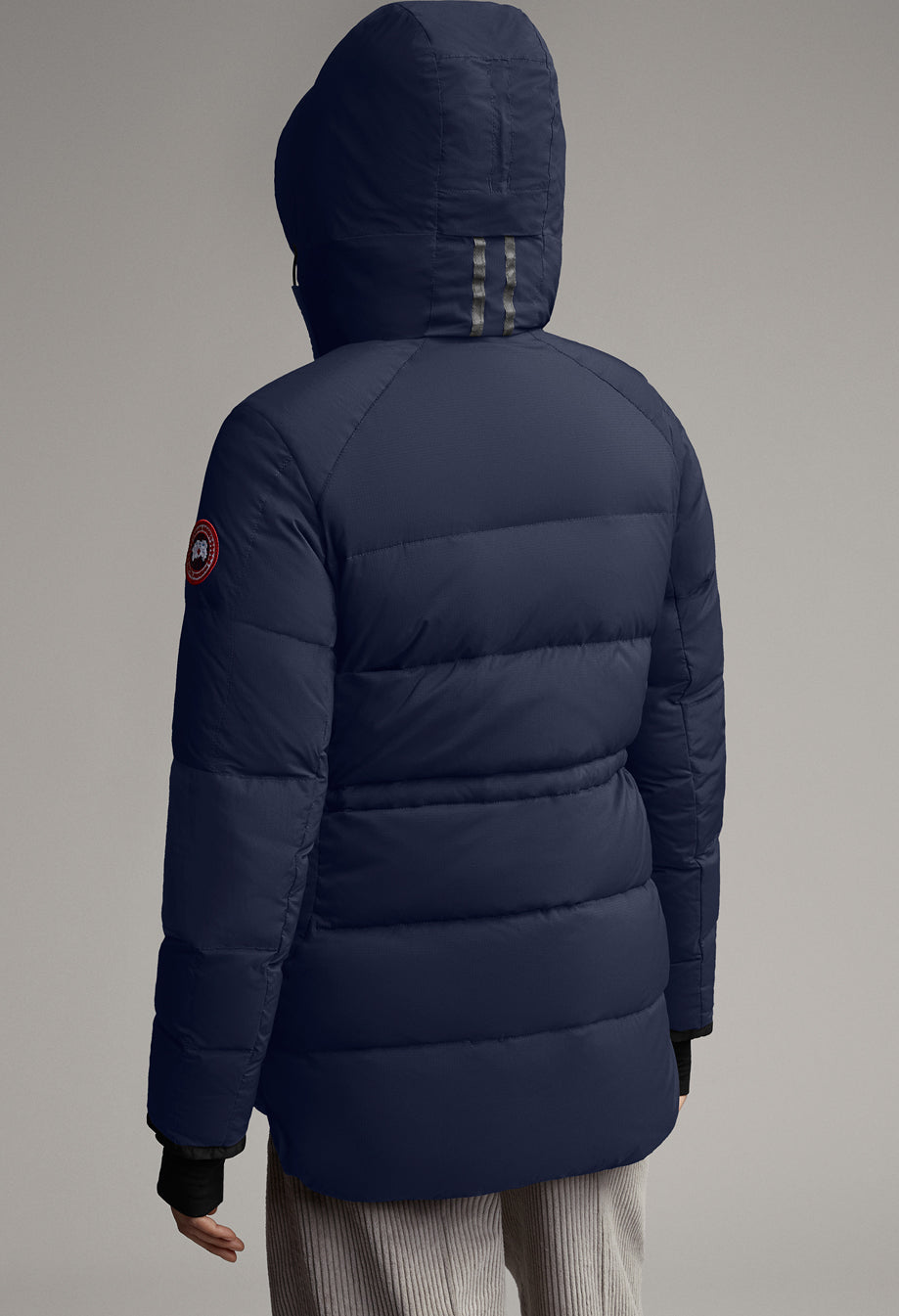 - 2-way adjustable down-filled hood adds warmth and element protection. Signature double-stripe reflective details at back for added visibility in low light