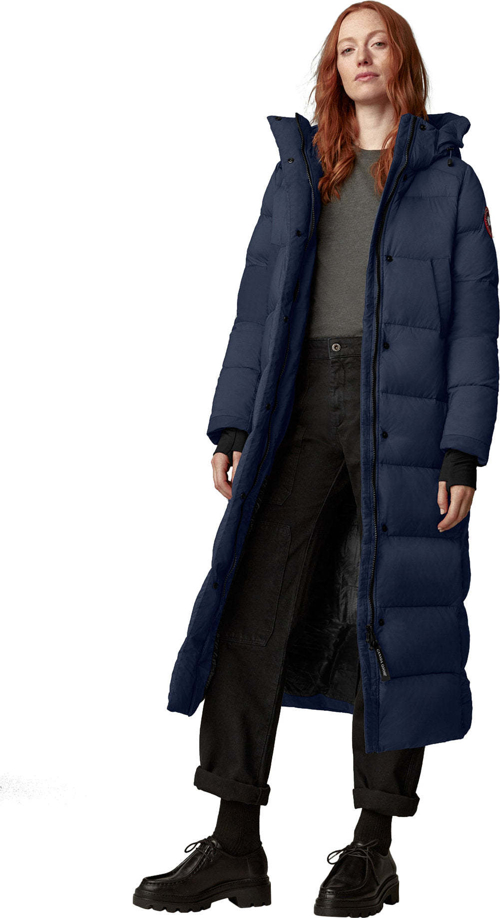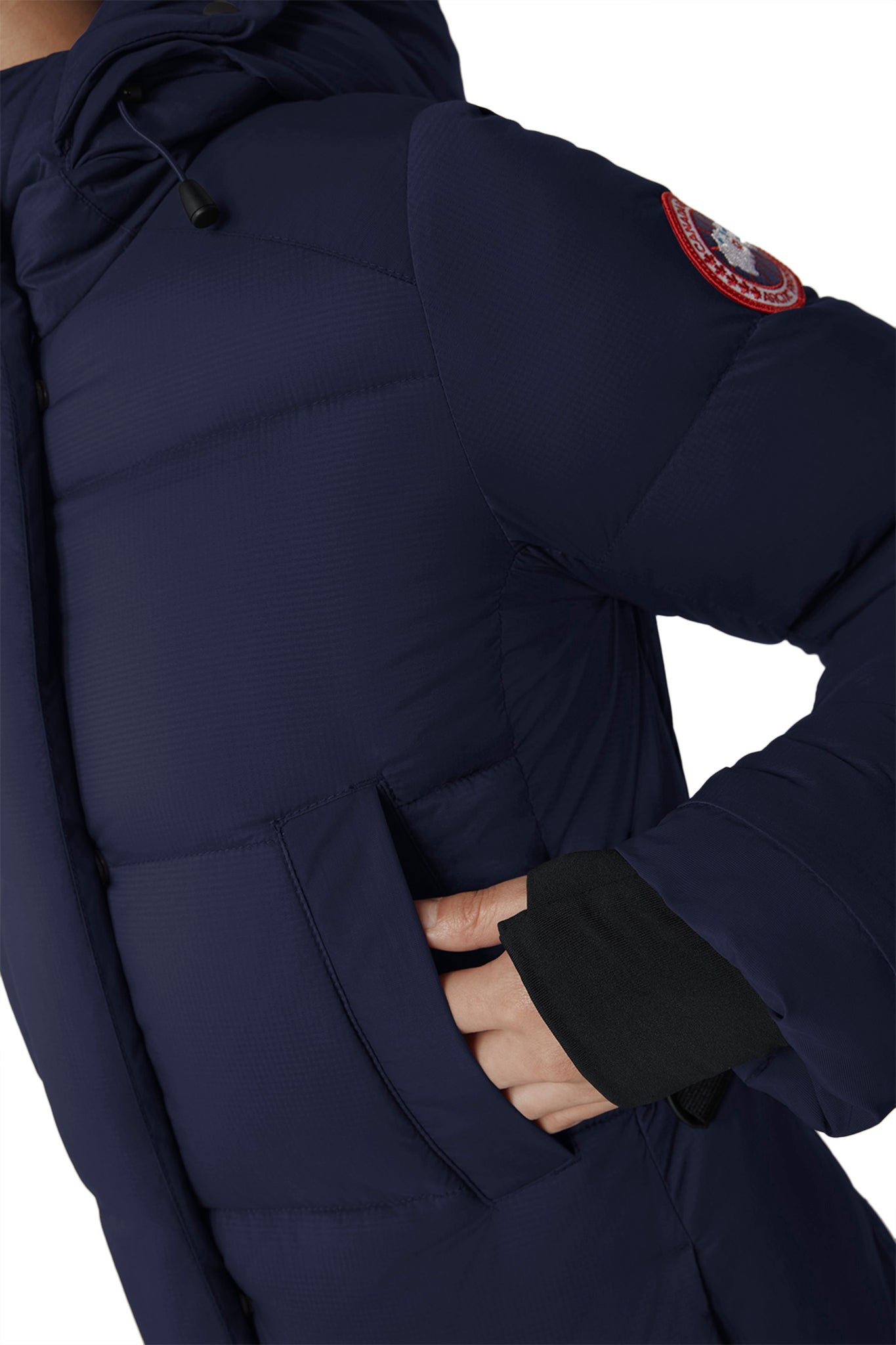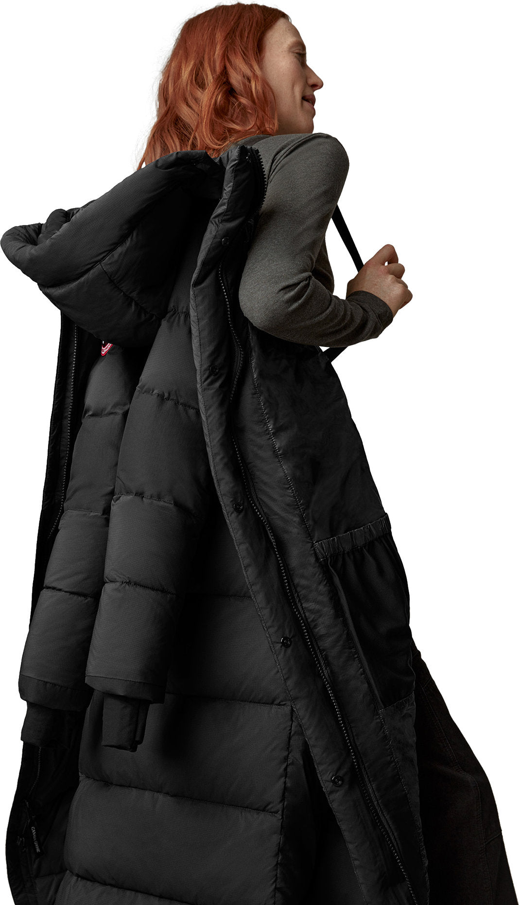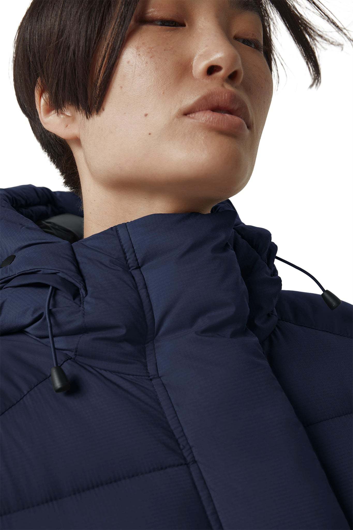 - Une patte garnie de duvet avec fermeture à boutons-pression dissimulée recouvre la fermeture éclair à deux sens pour vous protéger contre les éléments. La fermeture éclair peut être ouverte à partir du bas pour une ventilation et une amplitude de mouvements accrues.