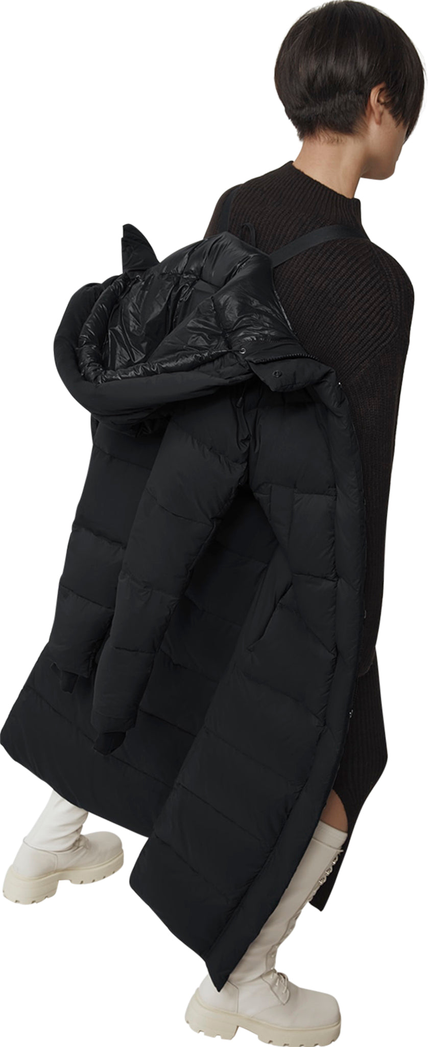 - Les courroies de style sac à dos intérieures permettent de transporter le manteau sur les épaules, sans encombrer les mains.