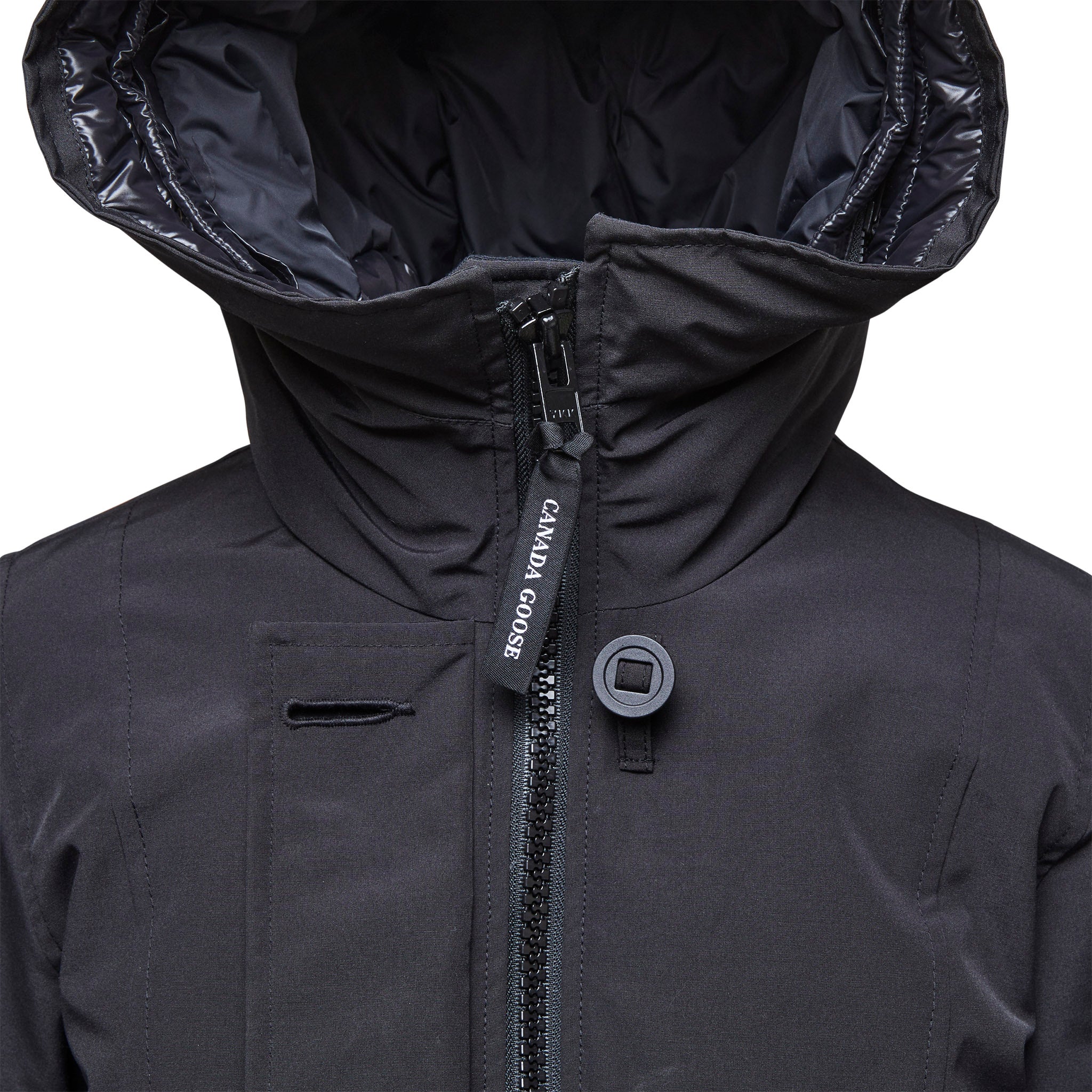 • Le capuchon garni de duvet s’ajuste de deux façons afin de vous garder au chaud et de vous protéger contre les éléments. La garniture en fourrure amovible contient un fil tenseur qui lui donne sa forme pour une protection supérieure