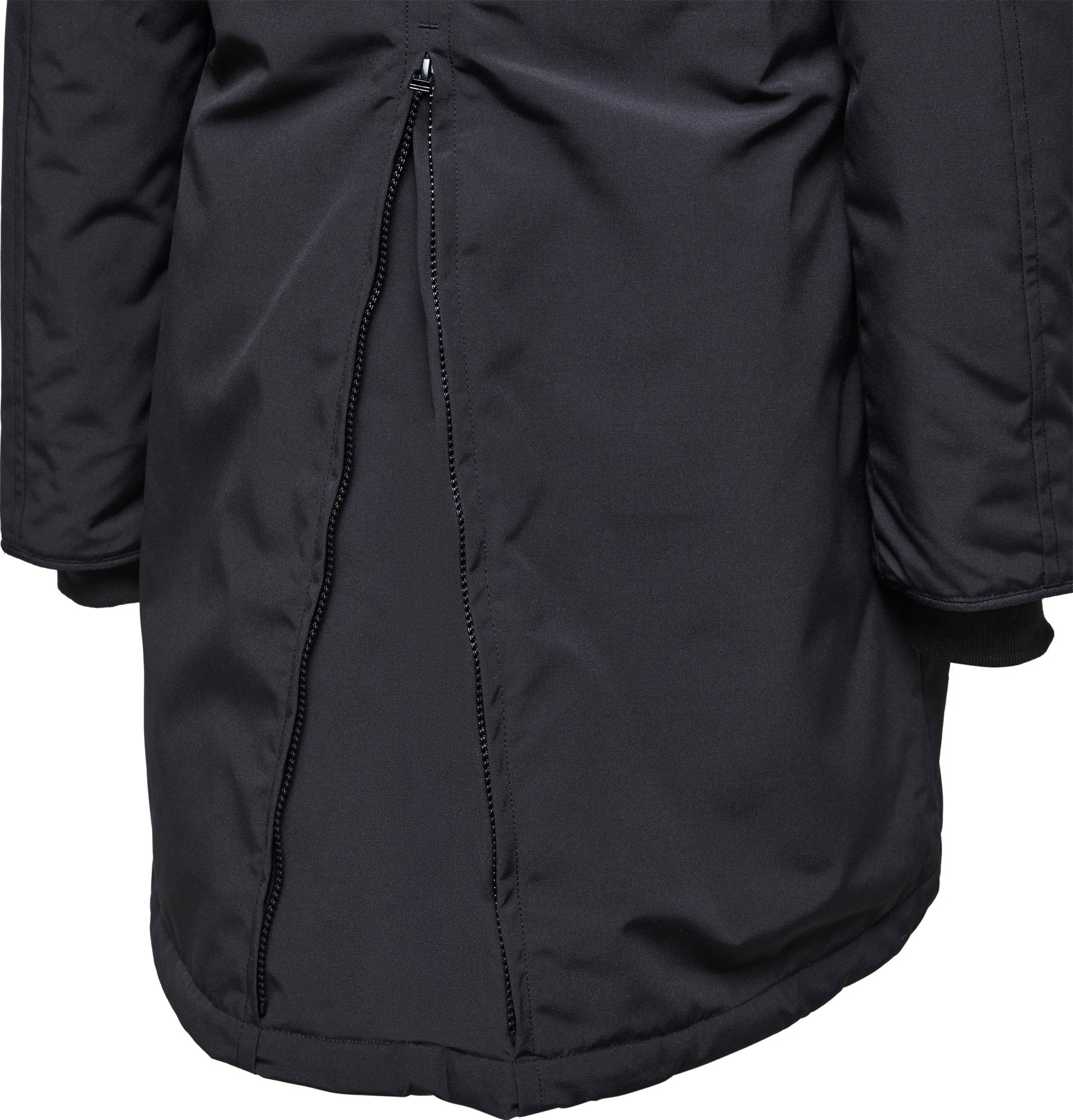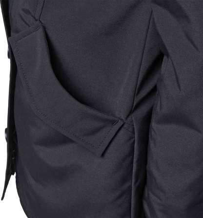 • Hem is longer in the back for added coverage. Back gusset with zipper closure opens up to adjust fit and add range of motion without compromising warmth and protection