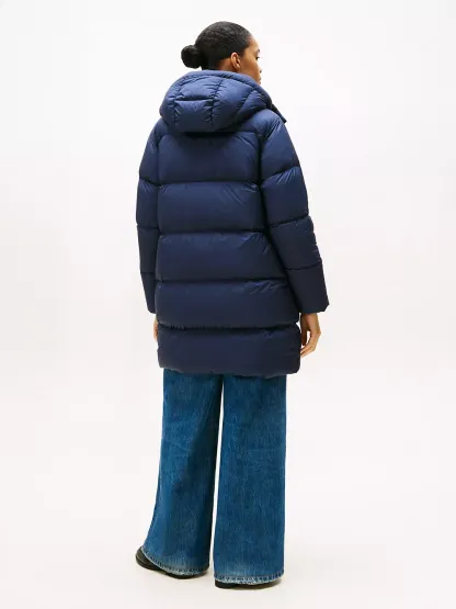 Tommy Hilfiger women's coat. Heritage style meets contemporary construction in this puffer coat, made chill-proof thanks to the down insulation, a high funnel neck and a fixed hood. This iteration is designed in a midi silhouette, intended to finish close to the top of the knee.