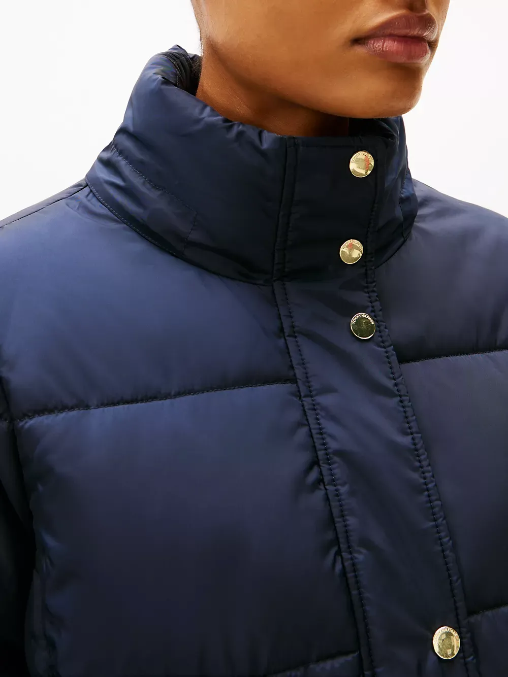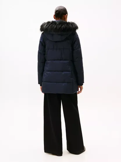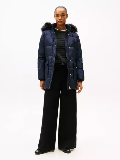 Tommy Hilfiger women's coat. The sturdy design of our puffer features a water-resistant shell, a detachable faux-fur-lined hood and elastic cuffs to seal in warmth while you stay comfortable. Lightweight insulation and plush lining at the collar and pockets keep you toasty, no matter how hard the cold winds blow.