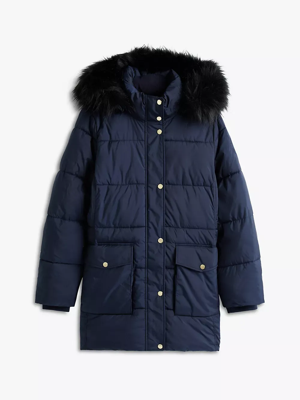 - Zip and snap closure, flap pockets, plush lining at the collar, detachable hood, detachable faux fur trim, ribbed cuffs.