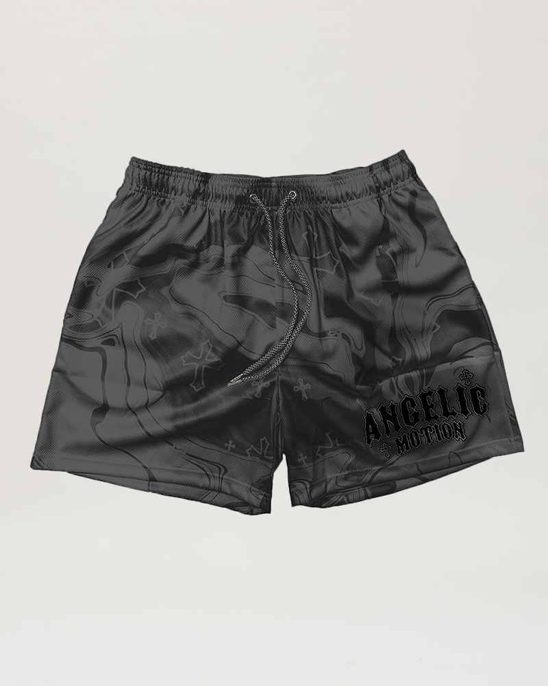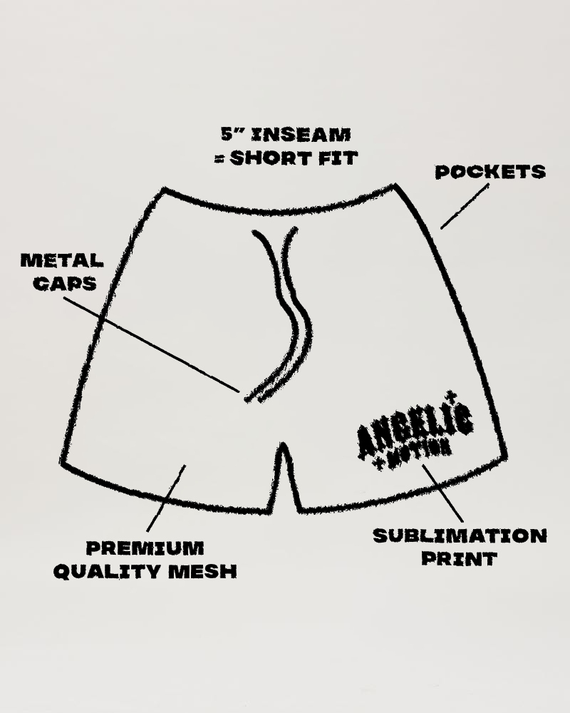 5" in inseams, metal caps, patterned drawstrings & deep pockets.
