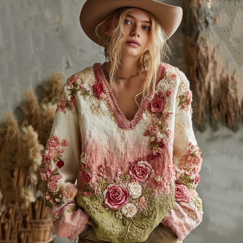 Love & Health Collection Retro Western Women Style Vintage Rose And Floral Patchwork Art V Neck Linen Shirt