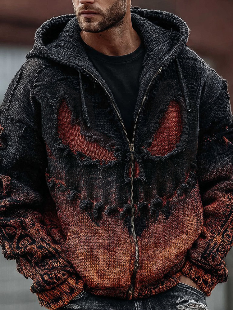 Men's Halloween Spooky Face Gradient Inspired Knitted Distressed Zipper Up Hooded Sweater