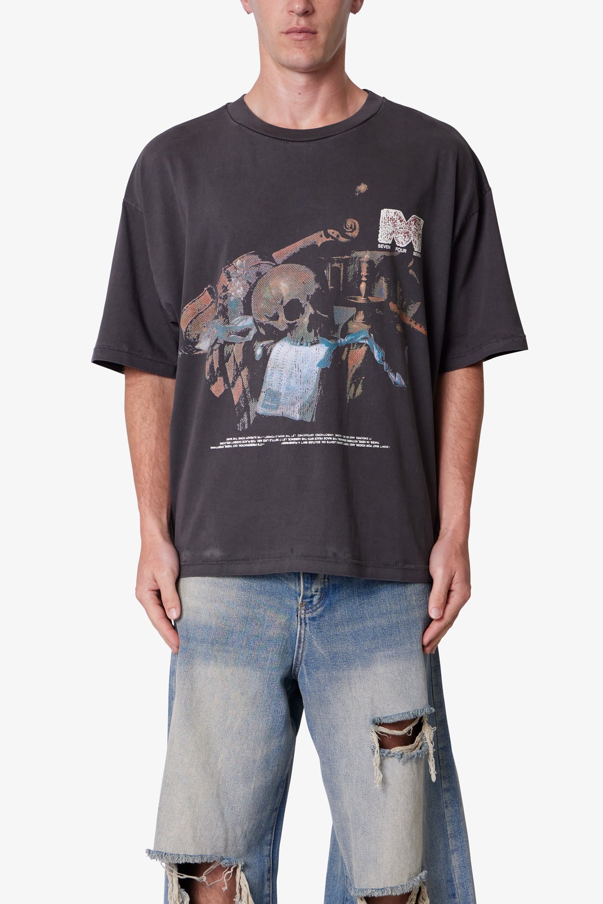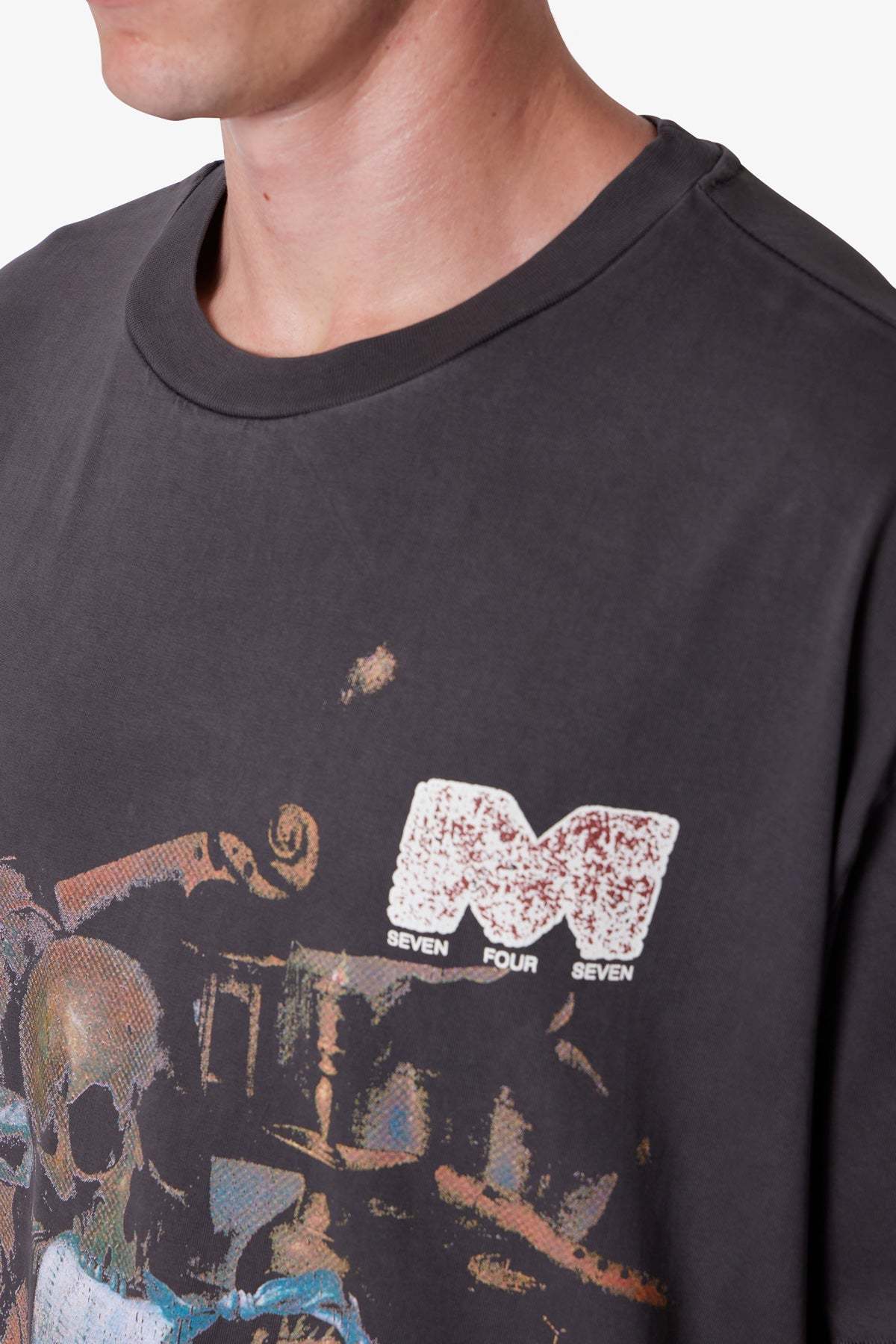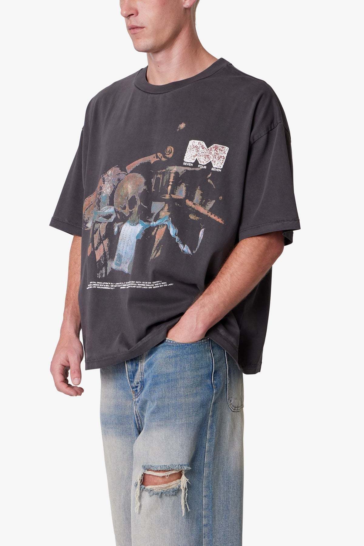 Made from 300 gsm cotton jersey with a vintage wash and pp spray, the Still Life Printed Tee features a cropped, boxy silhouette. Designed with distressed, cracked screen prints—a still life painting on the center front and “m 747” on the back—the tee is finished with neck ribbing and a worn, broken-in texture.