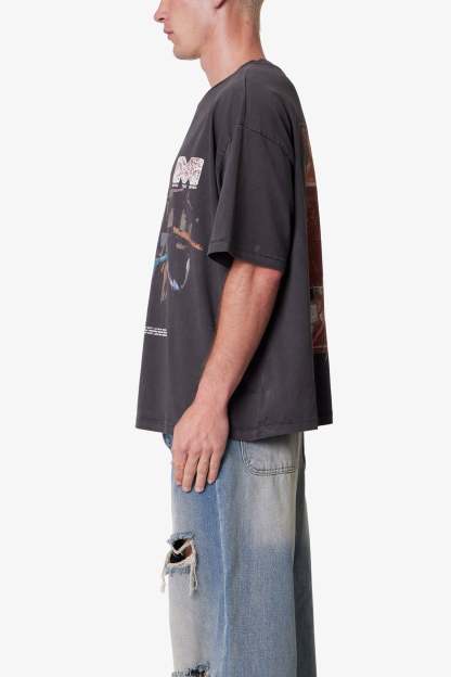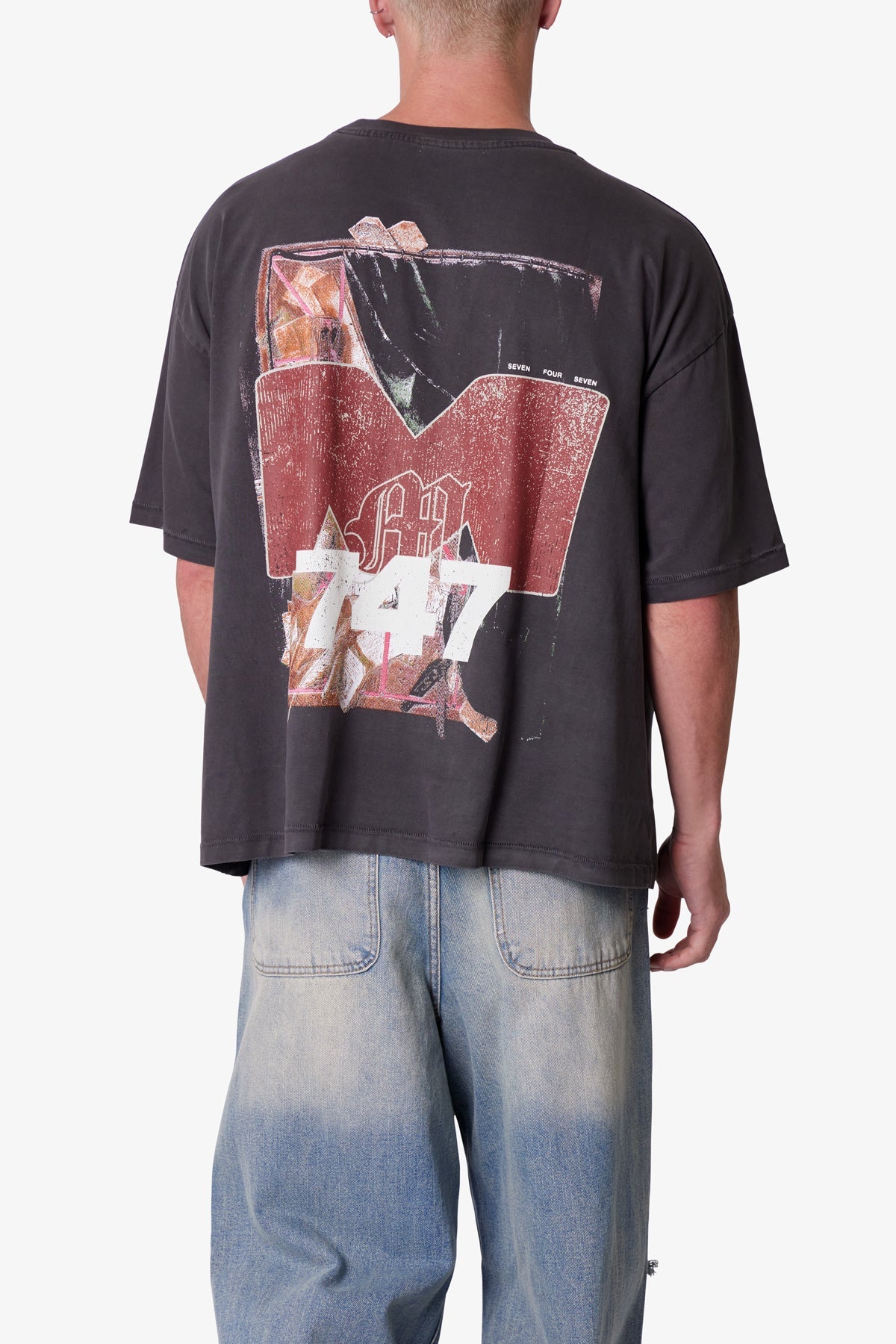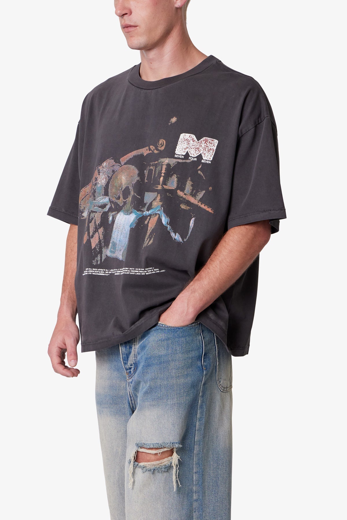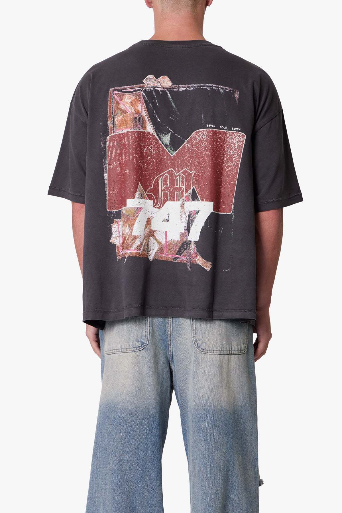 Made from 300 gsm cotton jersey with a vintage wash and pp spray, the Still Life Printed Tee features a cropped, boxy silhouette. Designed with distressed, cracked screen prints—a still life painting on the center front and “m 747” on the back—the tee is finished with neck ribbing and a worn, broken-in texture.