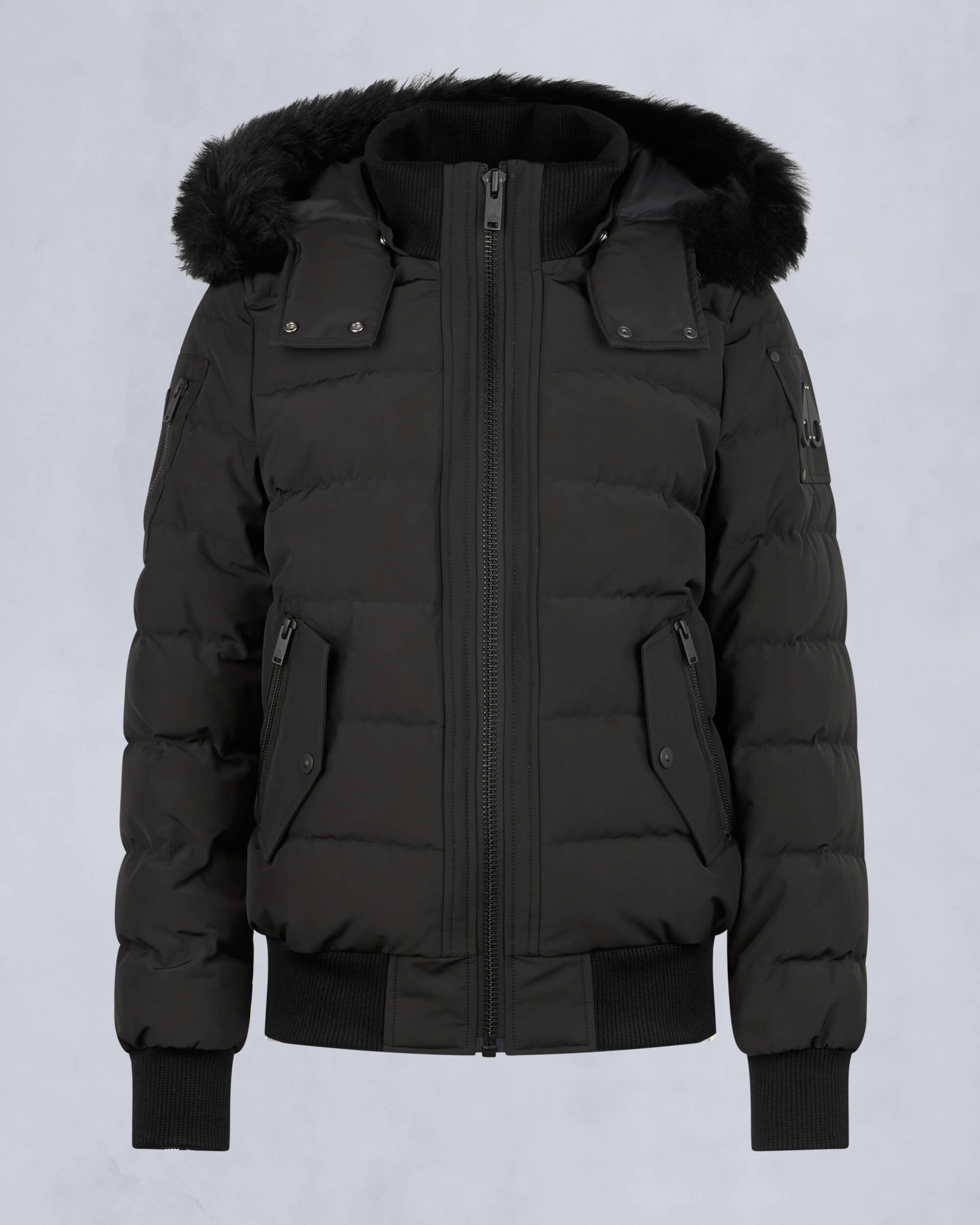 The Onyx Ladriere Bomber updates the iconic shape of the Debbie Bomber with horizontal baffles of lofty 90/10 goose down fill to achieve our highest insulation rating. The silky-soft mid-weight shell protects against wind and precipitation while remaining nearly soundless on brisk commutes. It's engineered with heat-retaining pockets and rib-knit trims to lock in heat and a detachable, plush lamb shearling-trimmed hood. A gleaming metal Moose Knuckles logo at the sleeve finishes the piece.