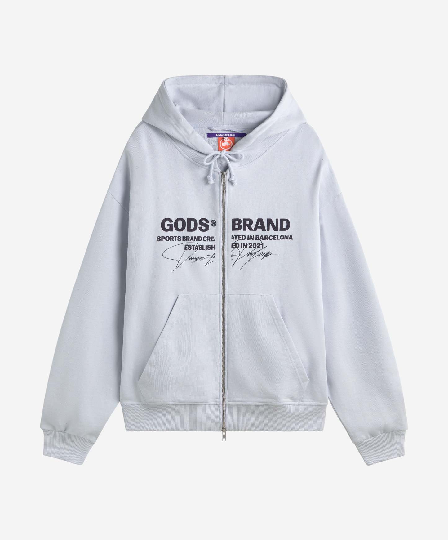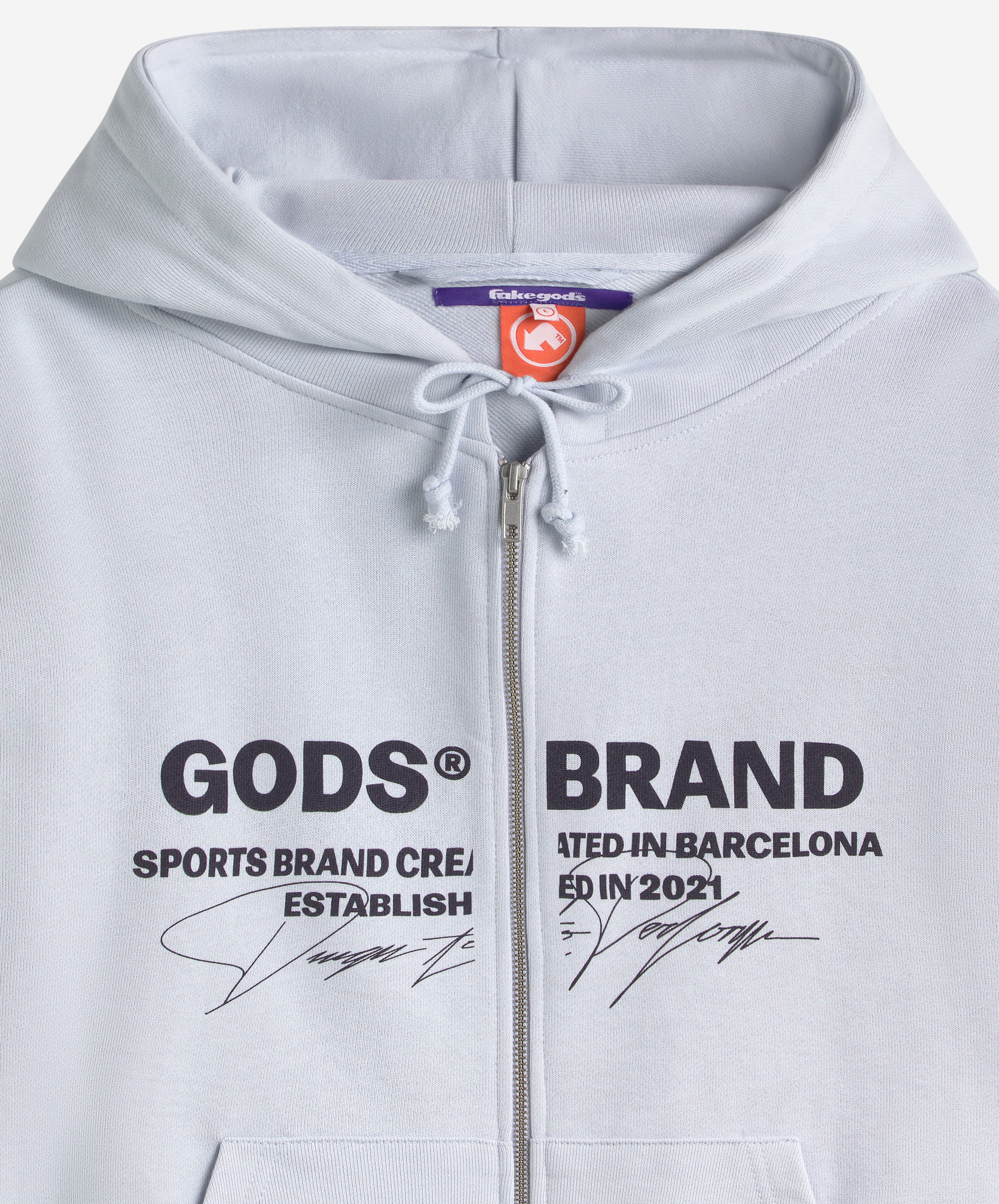 En el pecho destaca el logotipo “FAKEGODS BRAND” en tipografía bold acompañado de la firma manuscrita en contraste, reforzando su identidad única. La cremallera frontal aporta practicidad, mientras que el bolsillo tipo kangaroo, la capucha ajustable y los puños acanalados mantienen el diseño clásico de la hoodie.