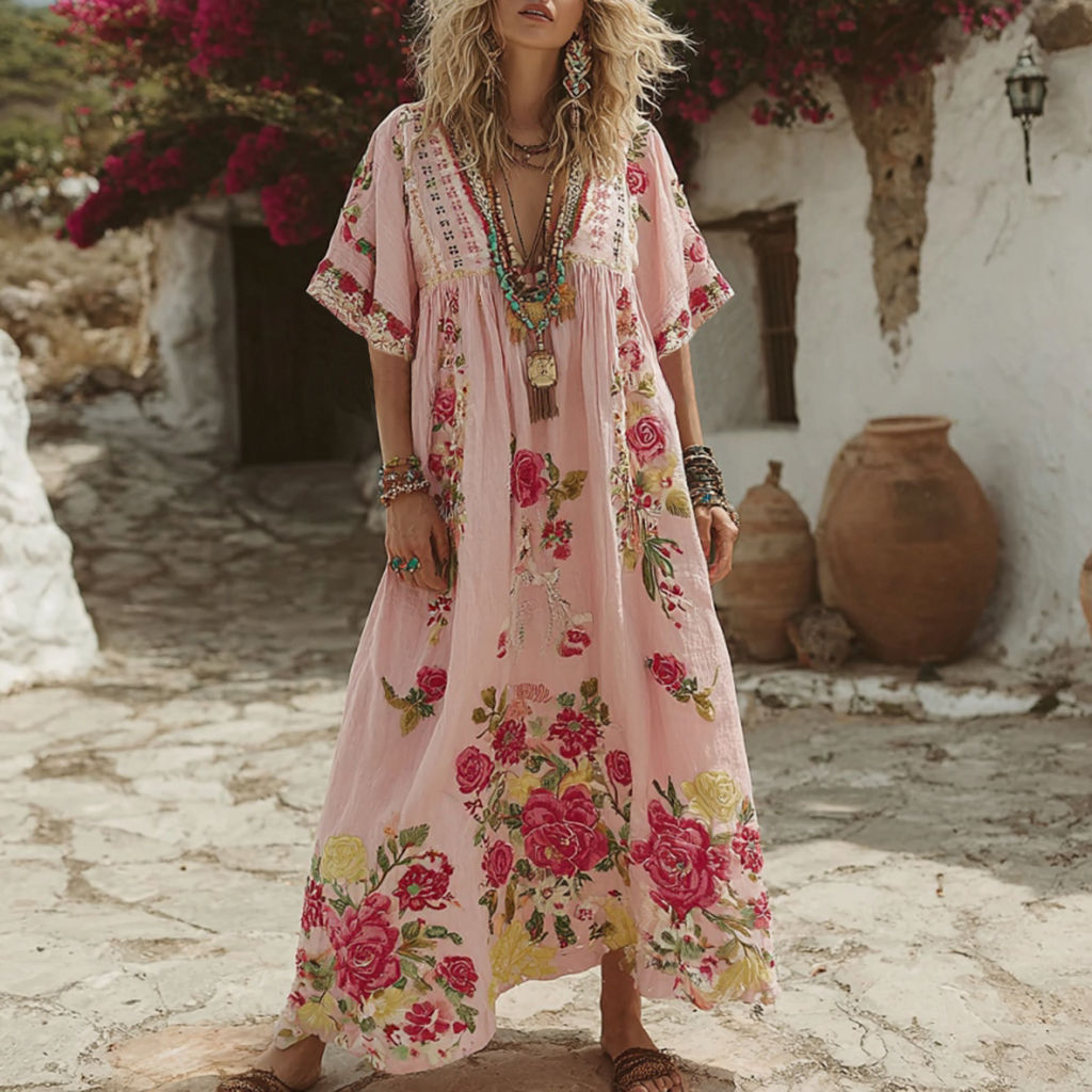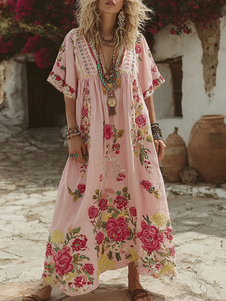 Women's Pink Rose Embroidery V-neck Short Sleeve Linen Blend Midi Dress