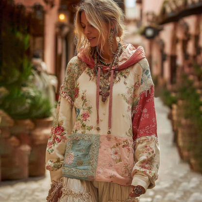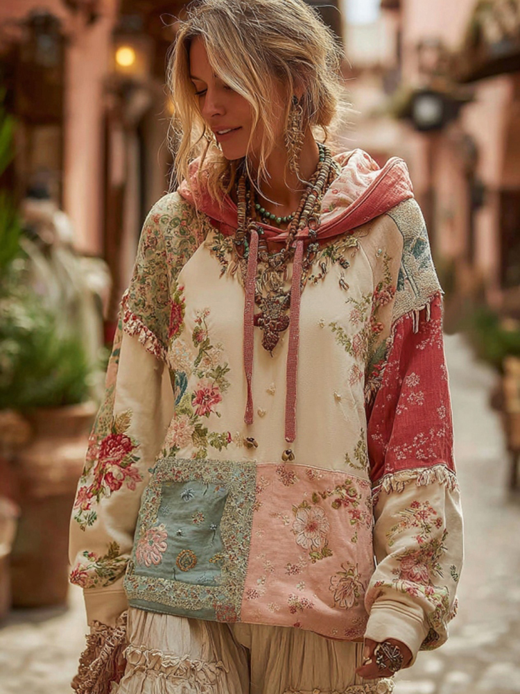 Women's Rose Embroidery Patchwork Boho Casual Hooded Sweatshirt