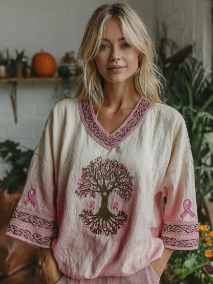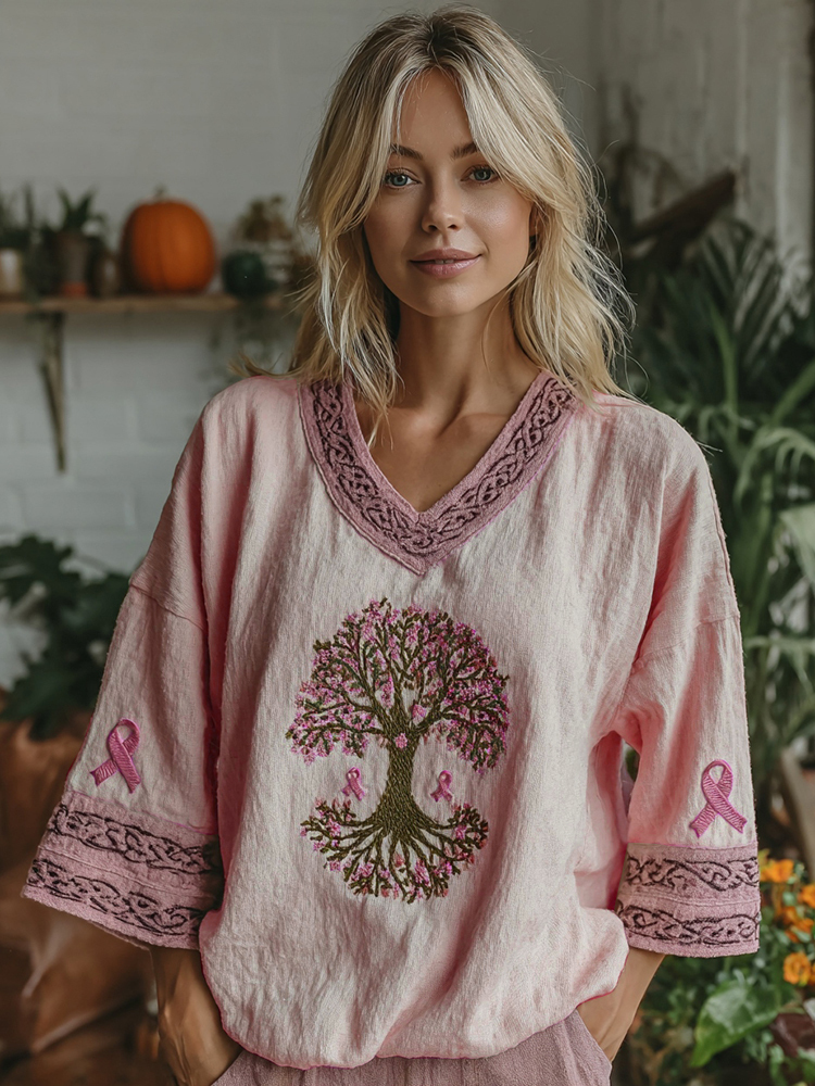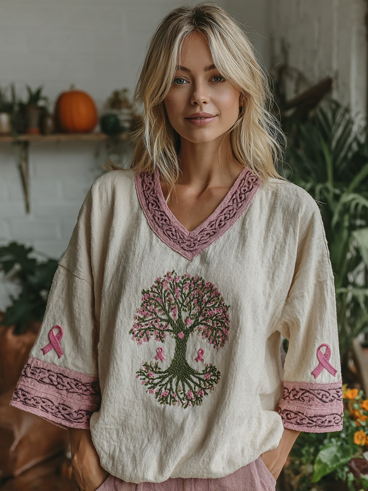 Women's Tree Of Life Pink Ribbon V-neck Half Sleeve T-shirt