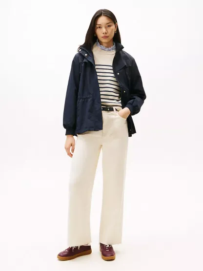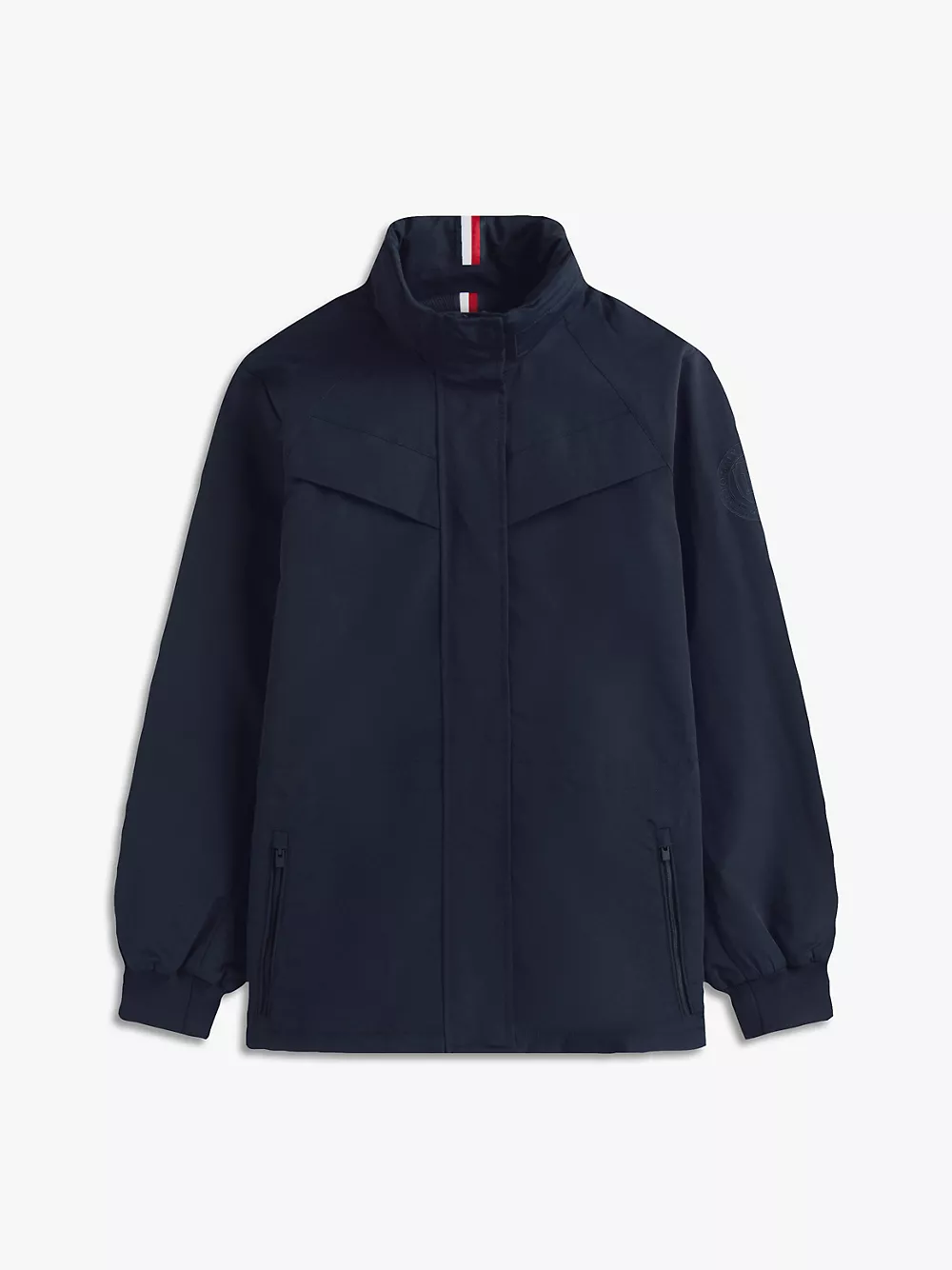 Tommy Hilfiger women's jacket. Our lightweight yacht jacket keeps the elements at bay without compromising on a flattering fit. Designed with a drawcord waist, a hidden hood at the collar, and a funnel neck, it seamlessly blends style and utility.